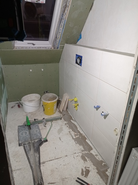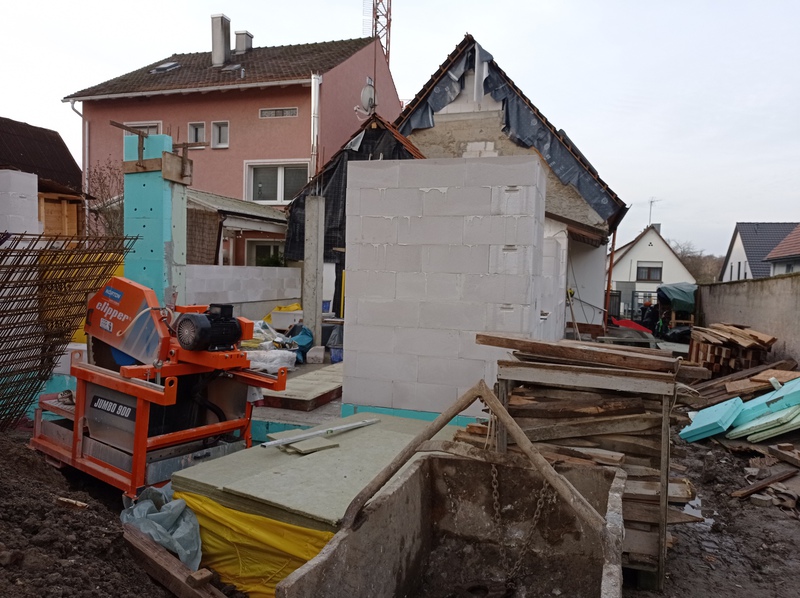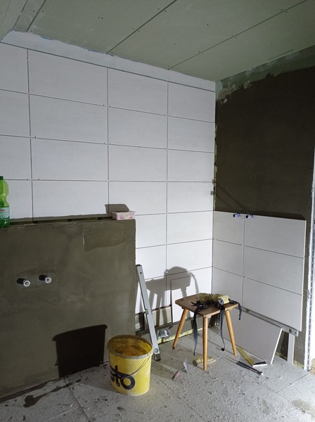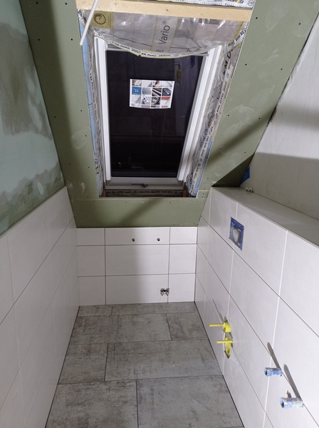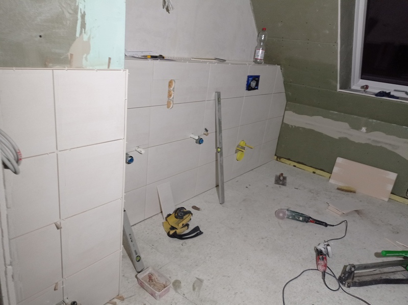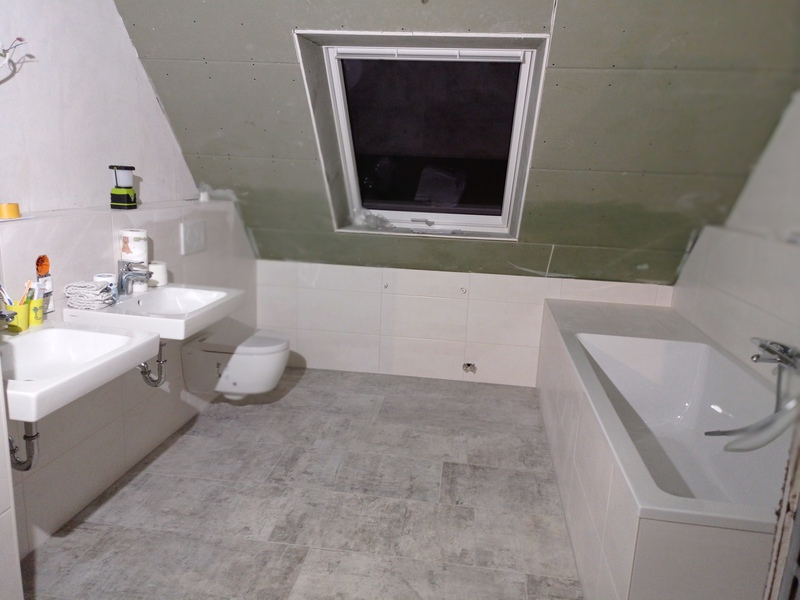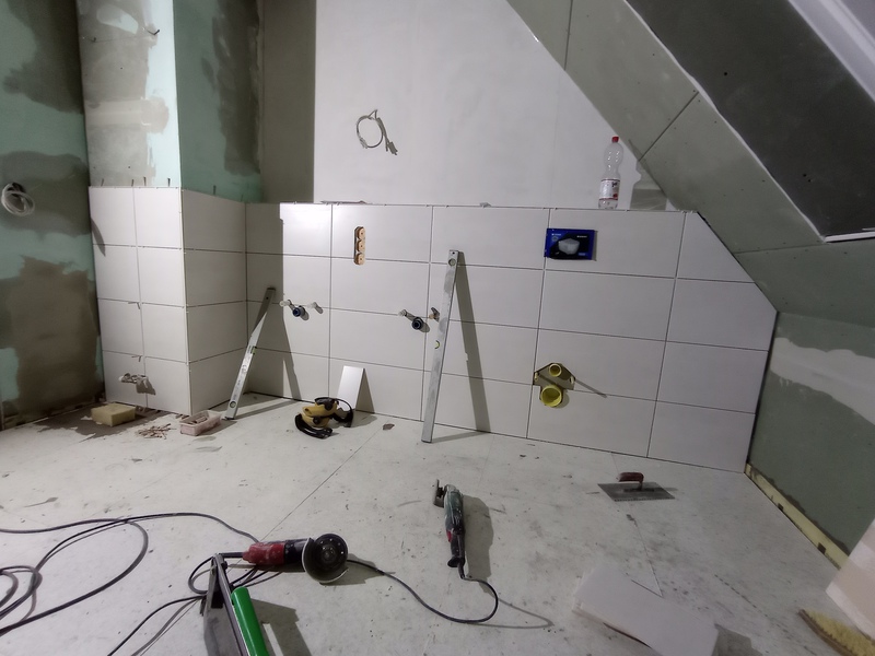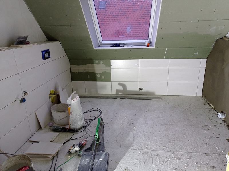 Die ersten Fliesen im Bad und der Anbau wird eingerüstet, Stand bis 02.12.21